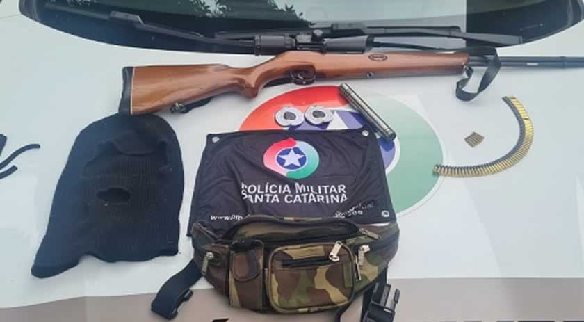 Os policiais militares acompanharam a vítima até a residência do casal para pegar alguns pertences pessoais, sendo permitida a entrada dos policiais na casa. Durante a busca, foi localizado em cima da janela um Rifle, Calibre .22, com supressor de Ruídos, 68 munições de Calibre .22 que estavam dentro de uma bolsa camuflada, possuindo dentro uma touca ninja.