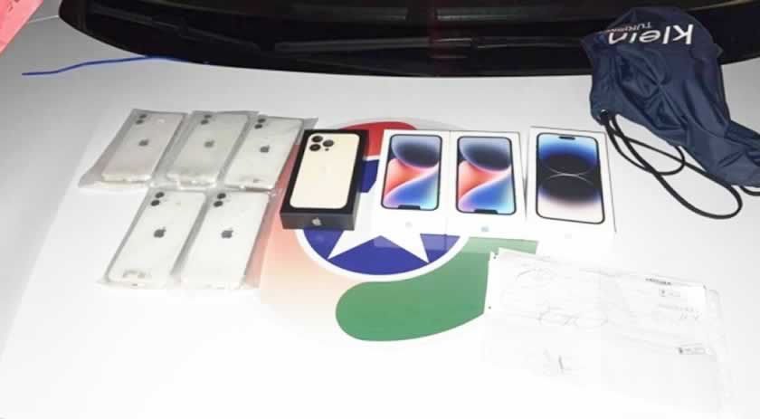 Durante abordagem, a polícia encontrou nove aparelhos celulares da marca Apple. Eram cinco iPhones 11, dois iPhones 14, um iPhone 14 pro Max e um iPhone 13 pro. Todos os eletrônicos estavam sem a documentação necessária, segundo a guarnição. O valor das mercadorias apreendidas é de aproximadamente R$ 40 mil.