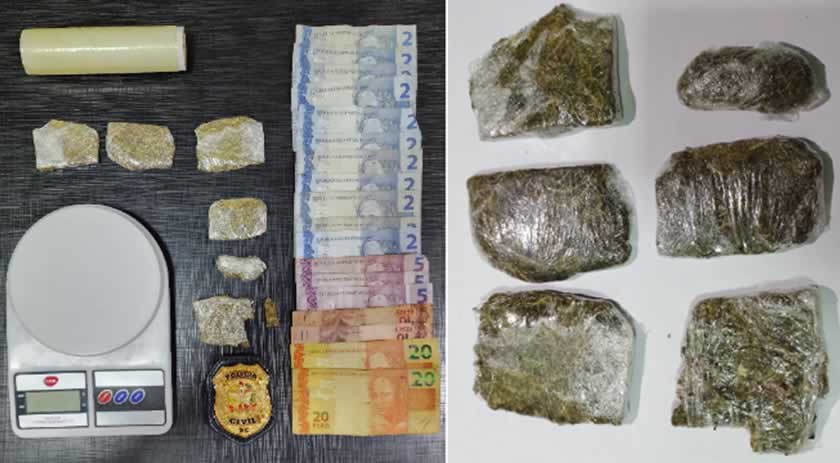No interior da casa foram encontradas porções de maconha já embaladas para venda, balança de precisão, plástico para preparação da droga e dinheiro em espécie.