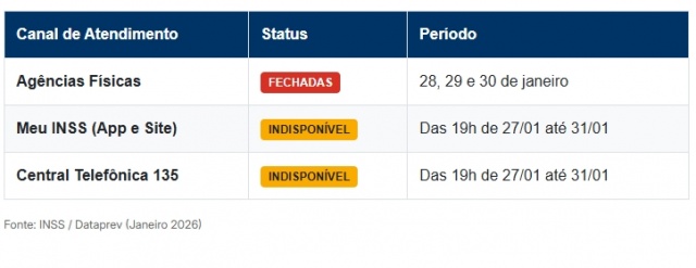 A suspensão temporária é motivada por uma modernização em larga escala nos sistemas previdenciários, conduzida pela Dataprev.A medida não afetará apenas quem pretende ir às agências. De acordo com o órgão, haverá um “apagão digital” nos canais de atendimento: o portal Meu INSS (site e aplicativo) e a Central Telefônica 135 ficarão indisponíveis a partir das 19h do dia 27 de janeiro, com previsão de retorno apenas no dia 31.