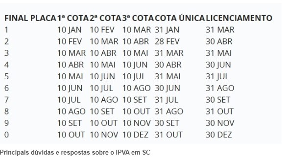 O contribuinte tem três alternativas para o pagamento do IPVA em Santa Catarina:Cota única: o imposto deve ser quitado até o final de cada mês, de acordo com o final de cada placa – o prazo para placas com final 1 vai até 31 de janeiro;