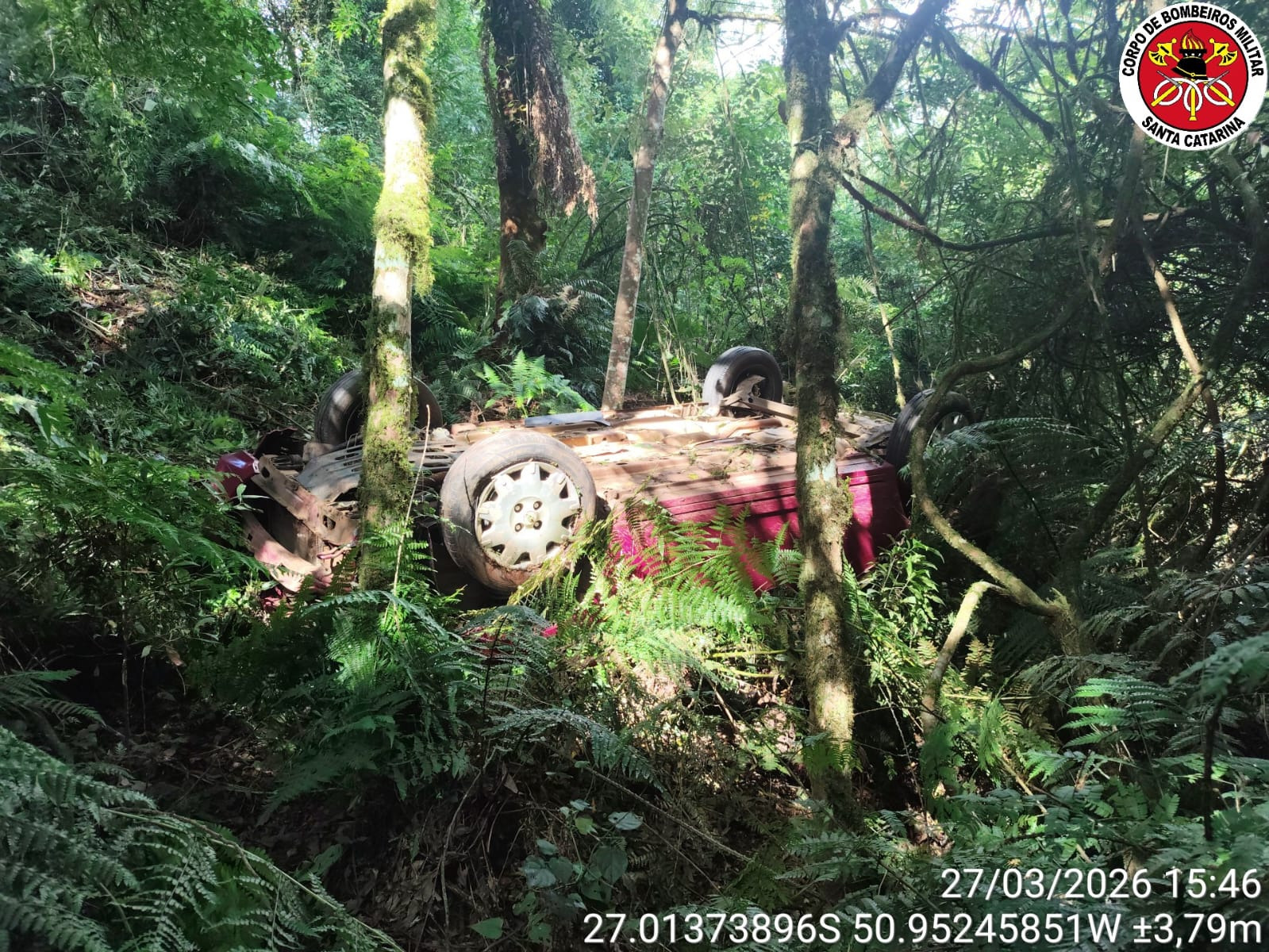 Automóvel despencou em meio à mata e parou com as rodas para cima.