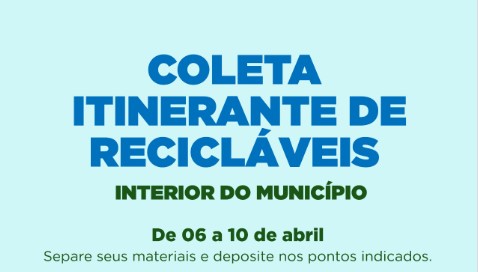 A coleta itinerante de recicláveis vai percorrer as comunidades do interior entre os dias 6 e 10 de abril, facilitando o descarte correto dos resíduos no meio rural.