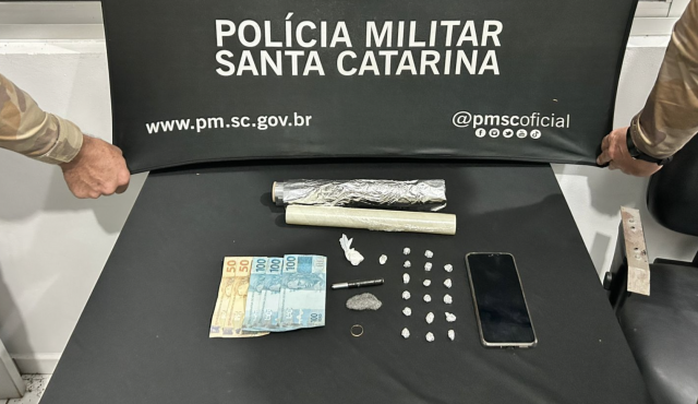 Durante a abordagem, foram localizadas 17 porções de crack e duas de cocaína, além de materiais utilizados para a comercialização das drogas.