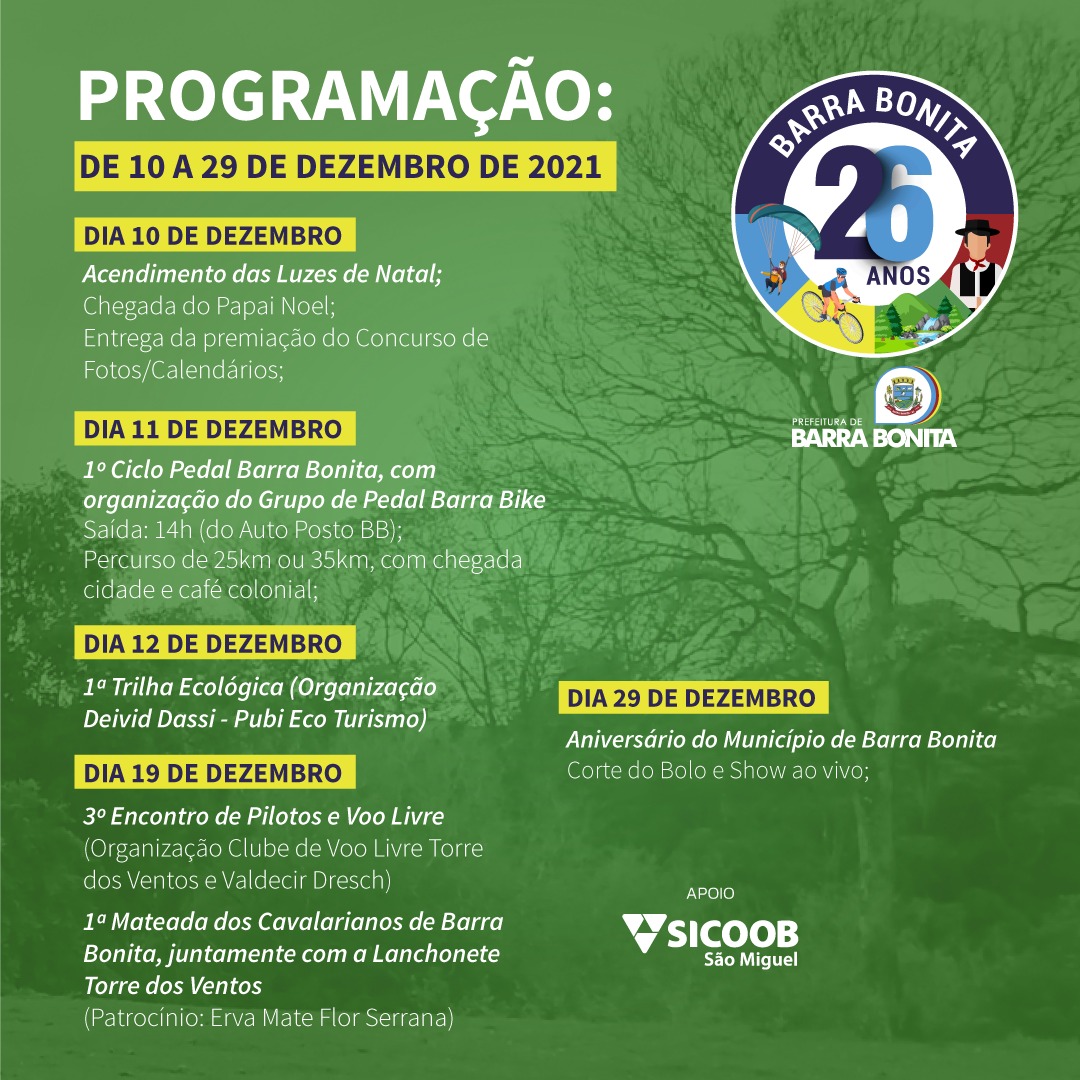 O município de Barra Bonita comemora seus 26 anos de emancipação no dia 29 de dezembro. Para marcar a data, uma extensa programação está sendo preparada pela administração municipal, parceiros e patrocinadores.