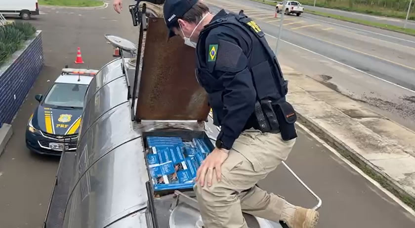 Uma ação conjunta entre Polícia Rodoviária Federal (PRF) e Polícia Militar Rodoviária (PMRv) de Santa Catarina apreendeu na tarde desta quarta-feira, dia 16, cerca de 100 mil maços de cigarros contrabandeados do Paraguai, escondidos em um caminhão-tanque, durante fiscalização na BR-282, em Herval d'Oeste.