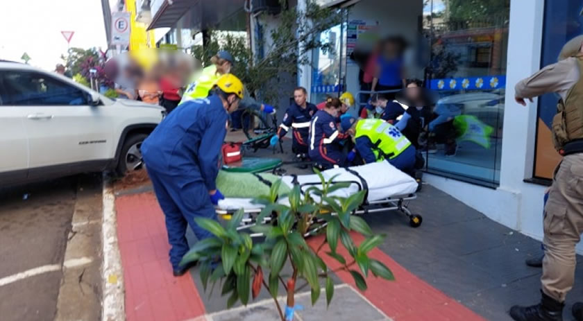Um veículo acabou subindo a calçada e atropelou pelo menos duas pessoas que estavam no local, por volta das 15h30 de quinta-feira (5), na Rua Santos Dumont, em frente a uma lotérica, no centro de São Miguel do Oeste.