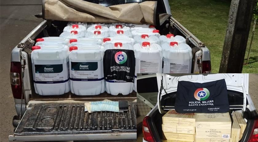 A Polícia Militar realizou a apreensão de 445 garrafas de vinho descaminhadas e 540 litros de agrotóxicos contrabandeados, nesta terça-feira, (28), em Dionísio Cerqueira.