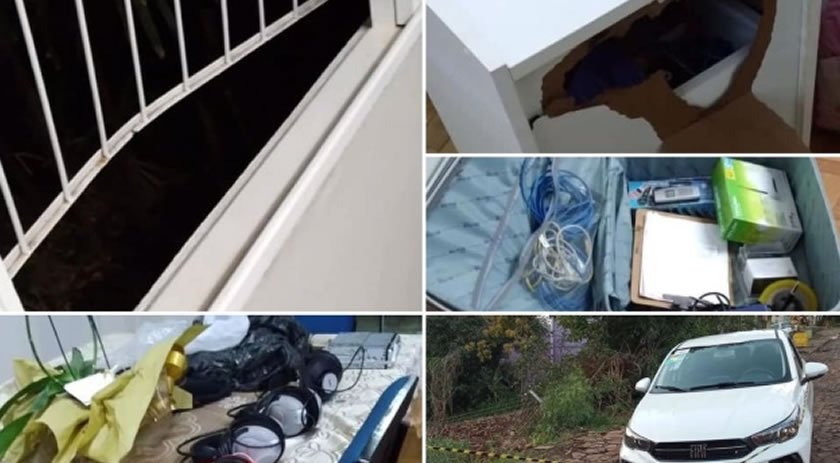 Outros equipamentos, como fones de ouvido e aparelhos de rádio, chegaram a ser reunidos em uma mala, mas acabaram abandonados pelo bandido na sala da janela arrombada.