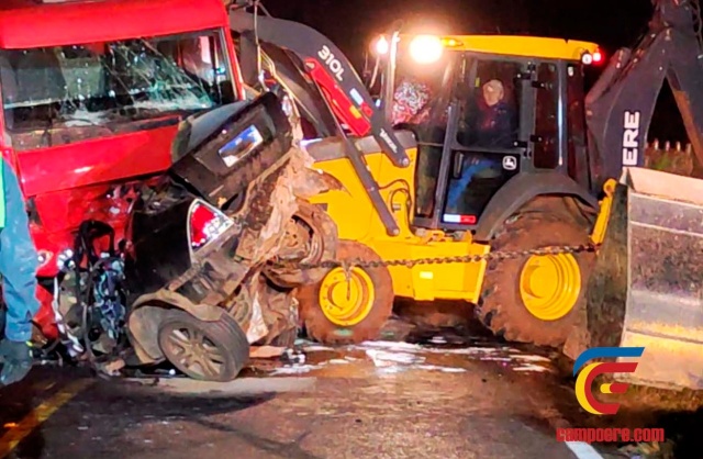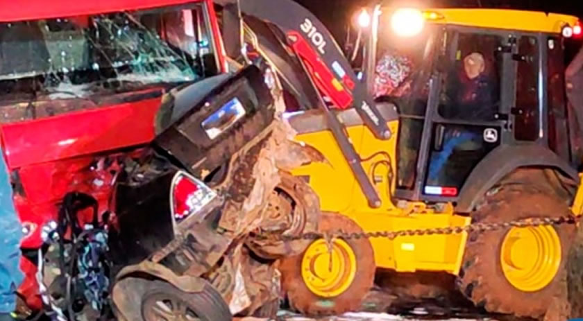 Bombeiros foram auxiliados por duas carregadeiras, sendo que um levantou o caminhão e a outra puxou o veiculo que estava em baixo dele. Os profissionais identificaram que no Ford/Fusion estava somente o condutor, que morreu na hora.