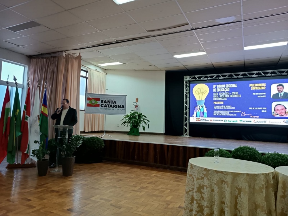 O 8º Fórum Regional de Educação da CRE Itapiranga teve as palestras do Professor Dr Odilon Poli da Unochapecó que falou sobre o tema “ A nobre missão de ensinar”, e a palestra com o professor Mestre Luis Duarte Viera da SED/ SC que falou sobre o tema: “ Educação profissional e tecnológica em SC: Desafios e possibilidades.” Também as escolas EEB São José de Sede Capela, EEB Santo Antônio de Linha Santo Antônio, EEB Cristo Rei de Cristo Rei, a EEB Pe Vendelino Seidel e a Casa Familiar Rural de Iporã do Oeste, socializaram suas experiências com os cursos técnicos implantaram.