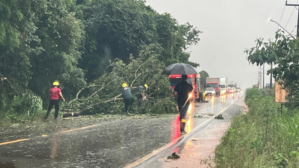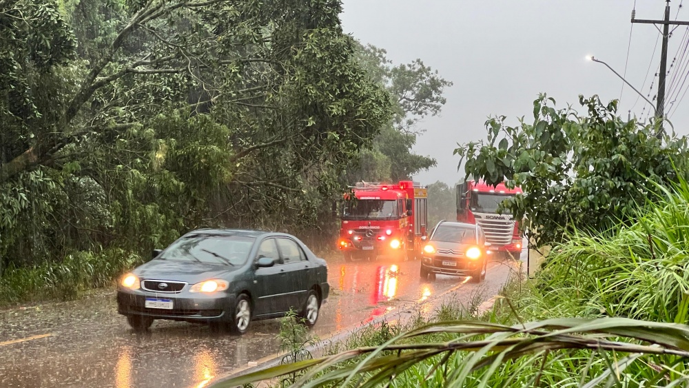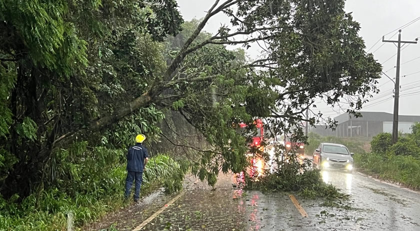 Na tarde desta quinta-feira (24), o Corpo de Bombeiros de São Miguel do Oeste foi mobilizado para atender diversas ocorrências causadas pela forte chuva e ventos que atingiram o município de Descanso. A primeira chamada aconteceu por volta das 14h, quando uma árvore caiu sobre a SC-163, nas proximidades da Zancan Auto Peças, bloqueando temporariamente uma das faixas da rodovia. Após o corte da árvore, o tráfego foi liberado.