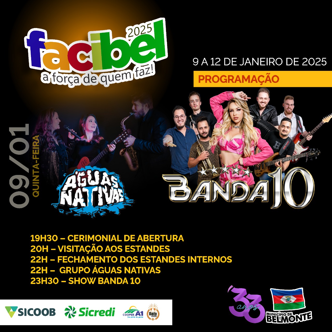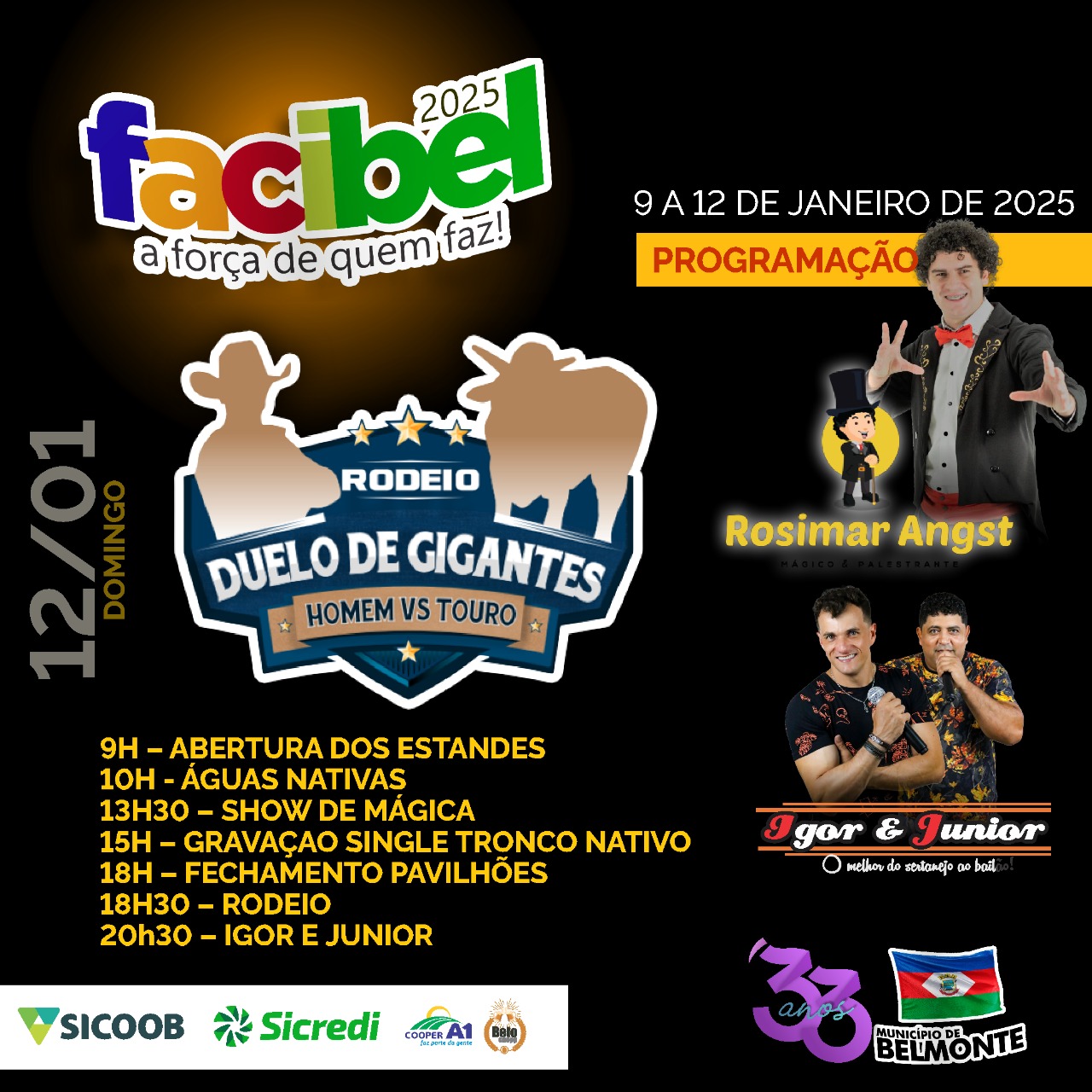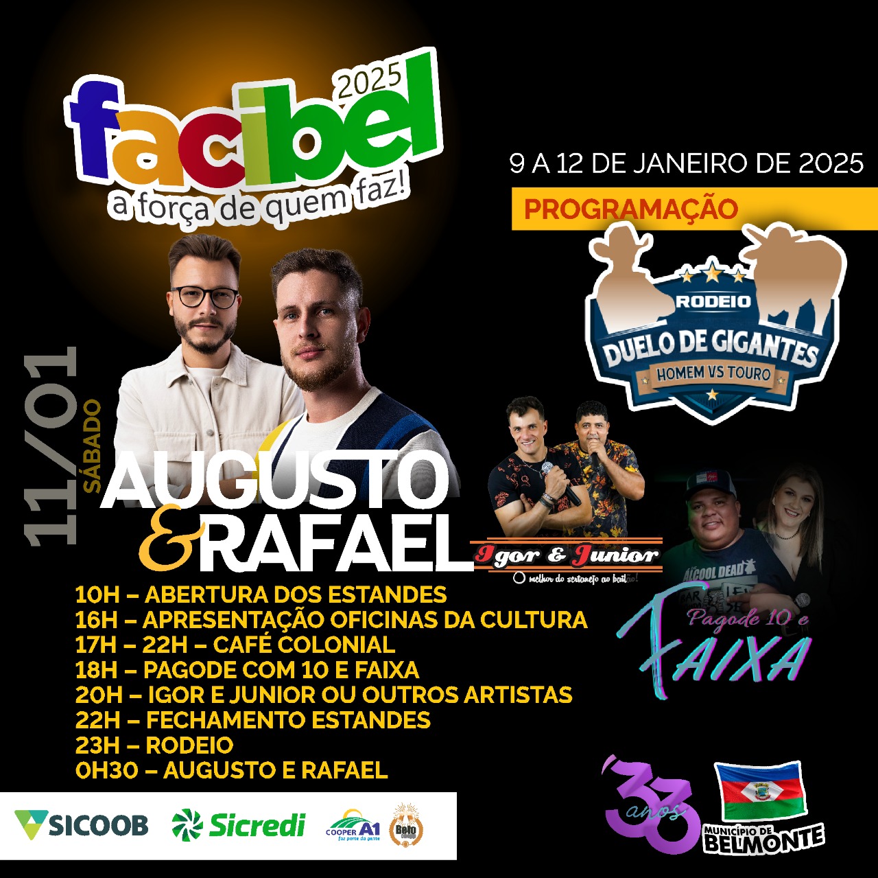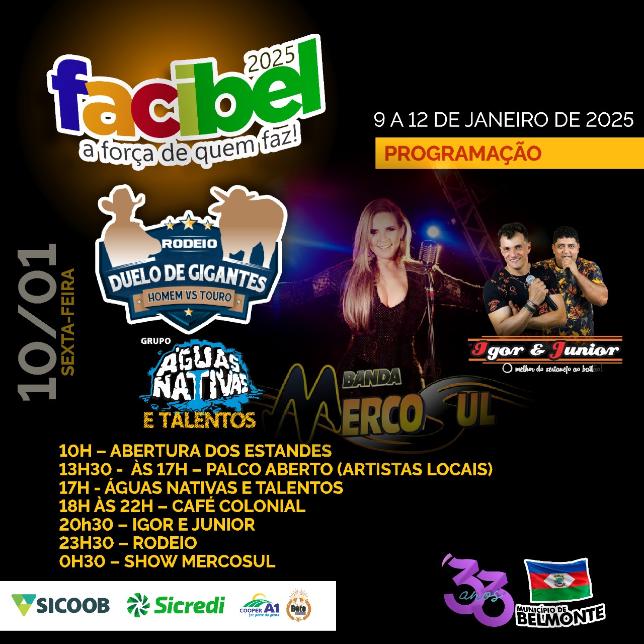 A Comissão Central Organizadora (CCO) da Feira Agropecuária, Comercial e Industrial de Belmonte (Facibel 2025), oficializou, nesta semana, a programação oficial do evento. Serão quatro dias de exposição, com mais de 110 espaços comercializados, rodeio nacional e shows regionais e nacionais e inauguração da praça central Auzílio Bortoluzzi. A Facibel acontece de 9 a 12 de janeiro de 2025, em comemoração aos 33 anos do município.