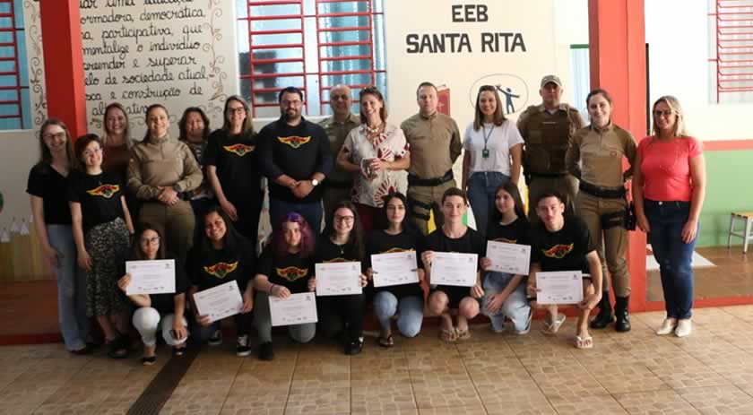 Concluíram o curso oito alunos do 3º ano do ensino médio da Escola Estadual de Educação Básica Santa Rita, após um ciclo de palestras que foram ministradas pela Rede Catarina de Proteção a Mulher, a Ordem dos Advogados do Brasil (OAB) e o Centro de Referência da Assistência Social (CRAS) que estimularam a reflexão e o desenvolvimento da consciência de que a família é um dos alicerces de uma sociedade harmoniosa e pacífica.