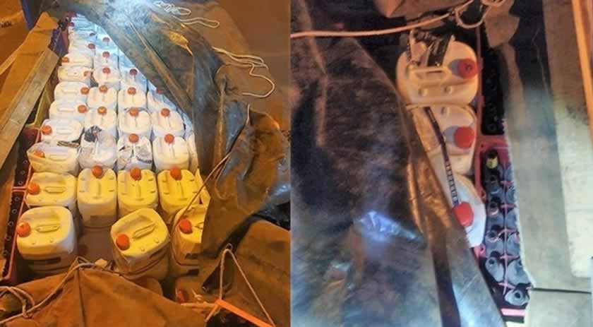 Porém, o homem levantou apenas parte da lona e mostrou algumas garrafas. Mas ao vistoriar o restante do compartimento, os policiais encontraram, em meio às garrafas, diversos galões do agrotóxico proibido no Brasil.