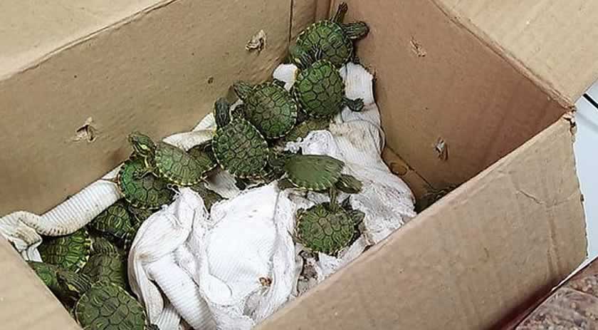 Os répteis, também conhecidos como cágados (tartarugas de água doce), estavam em uma caixa de papelão no banco traseiro de um Ford Ka com placas de São Paulo.