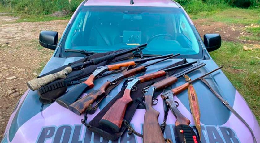 Eles estavam em dois carros na estrada geral da comunidade, segundo a polícia. Nos veículos com placas de Timbó Grande/SC, haviam homens e cachorros, além de seis espingardas de calibres.32, .20, .12.