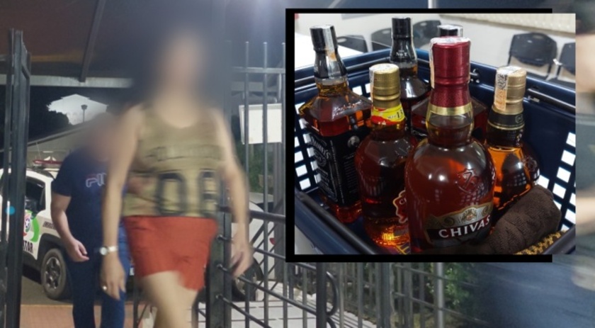 Neste sábado, por volta de 16h30, a mesma mulher entrou no estabelecimento e passou a ser monitorada. Câmeras de segurança registraram toda a ação. Em determinado momento, a autora escondeu três garrafas de whisky em uma bolsa e foi até o banheiro do supermercado, local onde escondeu as bebidas, trancou a porta e retornou para o interior do estabelecimento. Dando continuidade ao furto, a mulher colocou mais três garrafas dentro da bolsa, além de pegar um pacote de polenta. Logo depois, ela passou por um dos caixas e pagou somente pelo pacote de polenta. Ao tentar deixar o supermercado, a mulher foi abordada e a PM foi acionada.