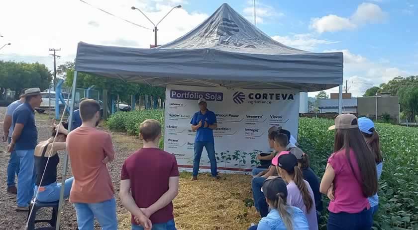 Em Maravilha, a área experimental do Curso de Agronomia recebeu os estudantes que puderam acompanhar as explanações sobre quatro temas: Manejo fitossanitário da soja, inseticidas e fungicida, com Lucas Yuri Furlanetto da Empresa Corteva; Uso de organomineral na cultura do milho e soja, com Marcos Berlezi da Empresa TMG; Desempenho e manejo cultivares da soja, com Luiza Borsoi da Empresa Terraplant Fertilizantes; e Desempenho e manejo cultivares de milho com Luiz Carlos Padilha Machado da Empresa Sempre Sementes.