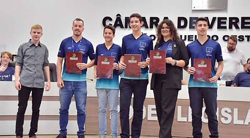 "A robótica educacional é um programa de atividades práticas que ampliam o conhecimento científico, estimulando a criação, experimentação e trabalho em equipe, desenvolvendo habilidades para planejar, formular hipóteses, proteger, empreender, dentre outros", destaca o vereador mirim, citando ainda os benefícios da prática para os estudantes. Luiz Felipe entregou uma cópia da moção aos homenageados.