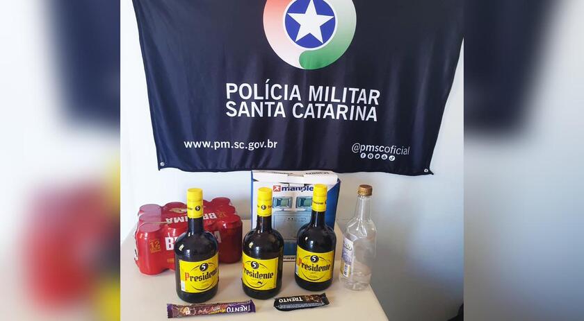 Foi possível constatar o furto de 22 latas de cerveja, sete refrigerantes, quatro litros de bebida alcoólica, 20 pacotes de salgadinho e mais 10 caixas de refrigerante de lata, além de chocolates e uma luminária de emergência.