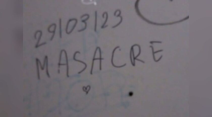 Na última segunda-feira (27), alunos encontraram escrito no banheiro feminino da escola a palavra “masacre”. Assustados, os estudantes alertaram o ocorrido à direção do colégio, que de imediato acionou a Polícia Militar. A mensagem encontrada no banheiro continha ameaça de massacre e informava a data de 29/03/23.