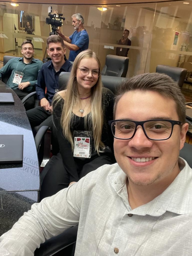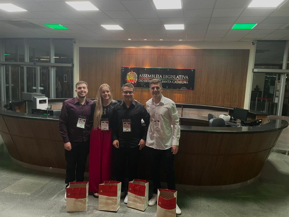 Quatro estudantes do Curso de Direito, da Unoesc São Miguel, participaram de 15 a 18 de maio, do Estágio-Visita na Assembleia Legislativa do Estado de Santa Catarina (Alesc), em Florianópolis. Afonso Henrique Henke, Gabriel Martini, Milena Isabel Bellini e Rafael Fachin Martins Pinto tiveram a oportunidade de vivenciar as atividades do Legislativo, como acompanhamento de discussões das comissões e sessões Legislativas.