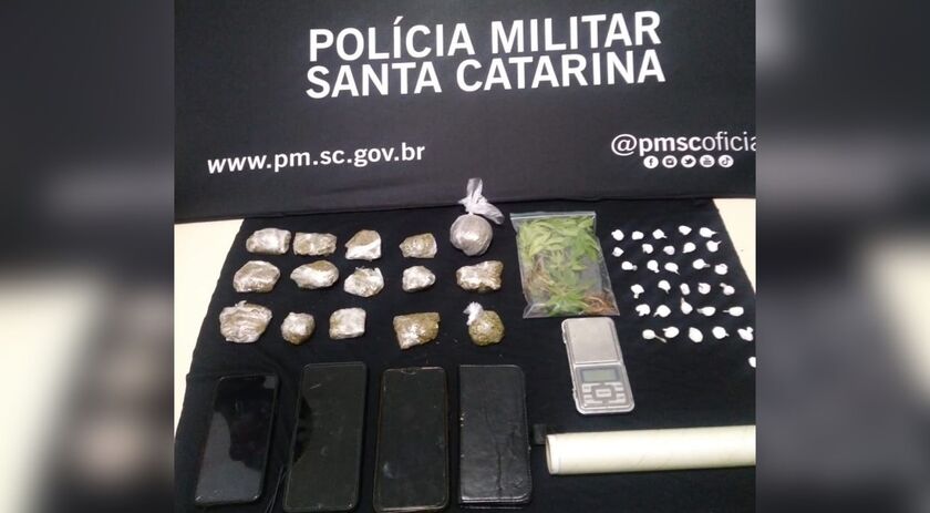 Durante as buscas, as guarnições, com o apoio do cão de fato do Canil Setorial, localizaram 15 frações de maconha e 31 frações de cocaína, prontas para a venda, além de quatro celulares e 12 pés de maconha em uma kitnet anexa ao local.