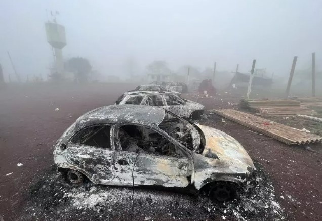 A equipe de reportagem do ND+ visitou a aldeia nesta segunda. Apesar da neblina densa, era possível visualizar cinzas onde antes haviam casas e destroços de carros queimados por toda parte, juntamente com alguns cães deixados para trás.