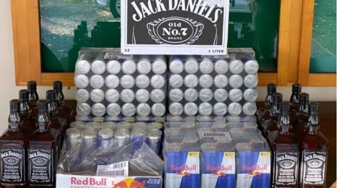 Em busca veicular foi constatado que sobre os bancos traseiros do veículo havia algumas caixas de som, contudo no porta malas, havia 12 (doze) Litros de Jack Daniel's e 132 (cento e trinta e dois) litros de energético da marca Red Bull.