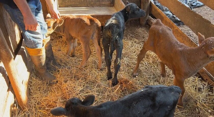 "Era de manhãzinha e ela saiu do rebanho. Como a gente tem um pouco de prática, viu que ela ia dar cria. Nasceu o primeiro terneiro, aí eu fui ver, porque achei que ela tinha mais, porque o primeiro era pequeno. Aí eu fui examinar, e ela tinha mais um. Aí eu tirei, mas ainda achei que ela estava grossa demais e podia ter mais. E para minha surpresa tinha mais dois ainda", conta o produtor rural.