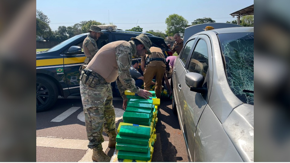 O veículo Volkswagen Voyage carregado com mais de 300 quilos de maconha foi apreendido no distrito de Ouro Preto em Toledo, no Oeste do Paraná, na tarde de terça-feira (22).