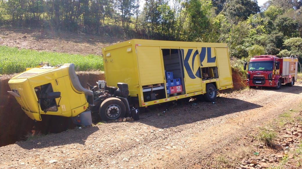Um caminhão, carregado com bebidas, acabou se envolvendo em um acidente de trânsito por volta das 11h desta quarta-feira (30), na estrada feral da Linha Boa Vista, interior de Pinhalzinho.