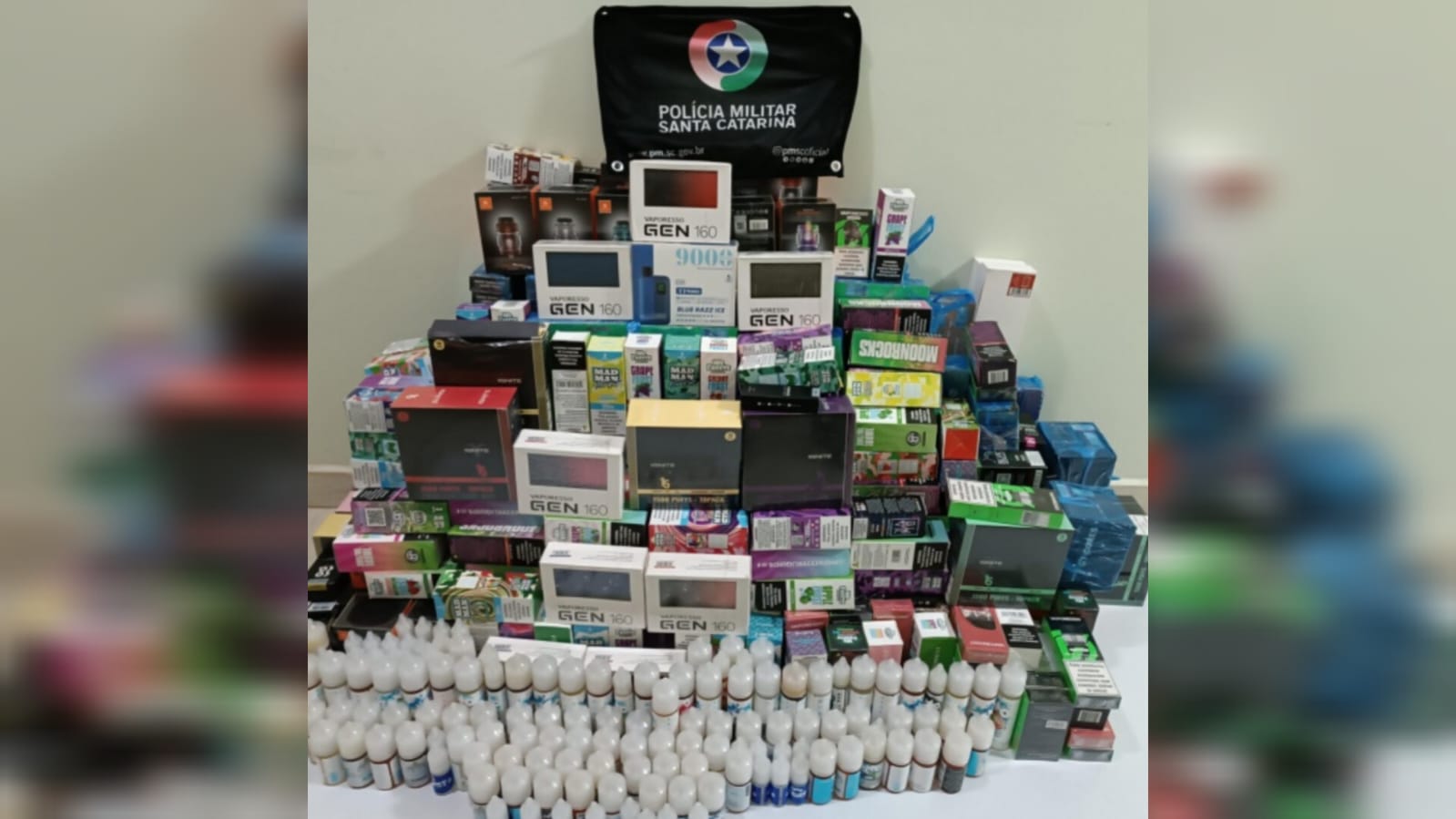 Na oportunidade a guarnição policial abordou diversos veículos. Ao fiscalizar um ônibus, que vinha da região de fronteira com o Paraguai, flagrou algumas bagagens contendo diversos produtos que têm entrada e circulação proibida no Brasil, em razão de serem seriamente prejudiciais à saúde. As mercadorias se tratam de vários cigarros eletrônicos e essências para a sua utilização.