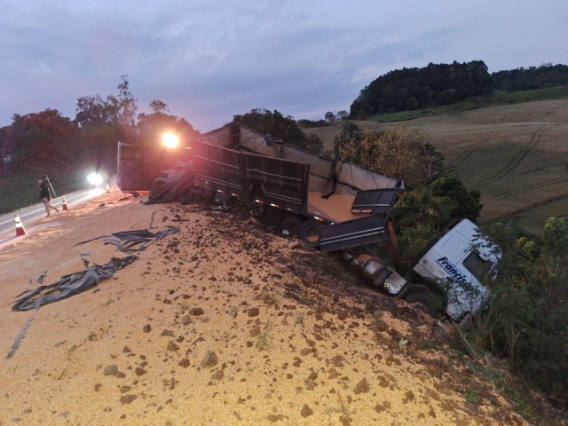 Uma saída de pista seguida de capotamento de um caminhão carreta carregado com milho foi atendida pelo Corpo de Bombeiros de São José do Cedro, com apoio das guarnições de Guaraciaba. O acidente de trânsito ocorreu nesta sexta-feira (29), por volta das 5h, na rodovia BR 163, na Linha Santo Antônio, no Município de São José do Cedro. No local, os bombeiros socorreram um homem 26 anos, consciente e desorientado, sinais vitais normais, já fora do caminhão, nas margens da via. Após avaliação pelos bombeiros e demais procedimentos, ele foi imobilizado e conduzido ao hospital para cuidados médicos. Foi realizado limpeza da pista e a cena ficou a cuidados da PRF.