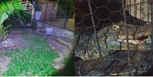 O jacaré foi localizado pelos policiais no pátio da casa, que fica entre três residências. A principal suspeita é de que ele tenha saído de um açude, que fica próximo ao local.