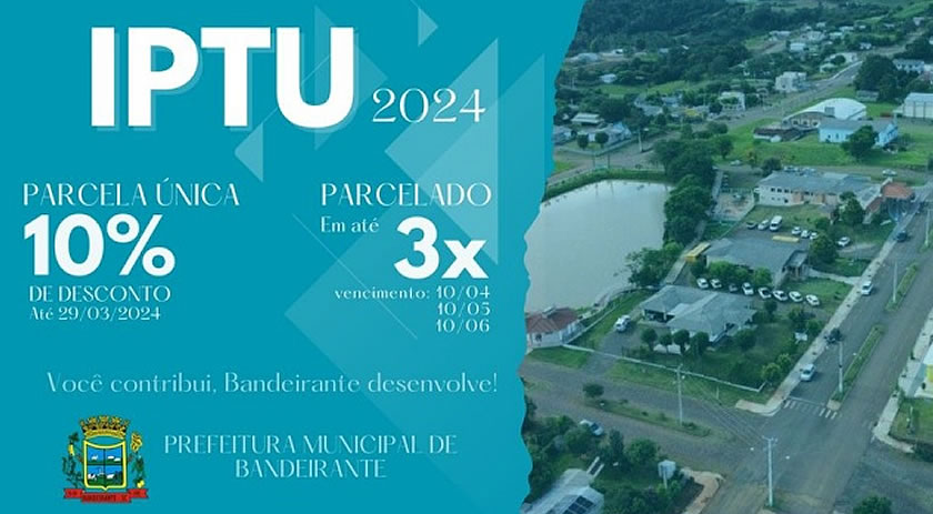 O pagamento dos carnês do IPTU do Município de Bandeirante/SC em cota única vai ter desconto, conforme a informação da Administração Municipal. Já estão disponíveis os carnês do IPTU, que é o Imposto Predial e Territorial Urbano de Bandeirante, para o exercício de 2024.
