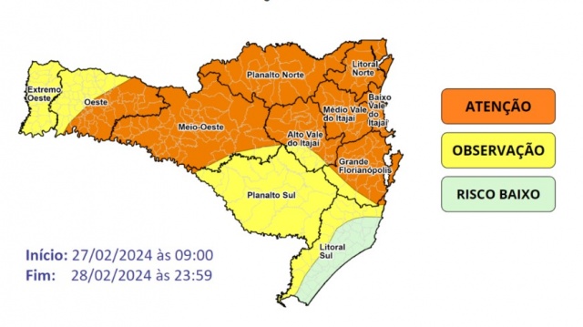 A Defesa Civil de Santa Catarina emitiu alerta para temporais e chuvas pontualmente volumosas nesta terça-feira (27) no Estado. As instabilidades no tempo são causadas pela aproximação de uma frente fria vinda do Rio Grande do Sul combinada a uma área de baixa pressão.