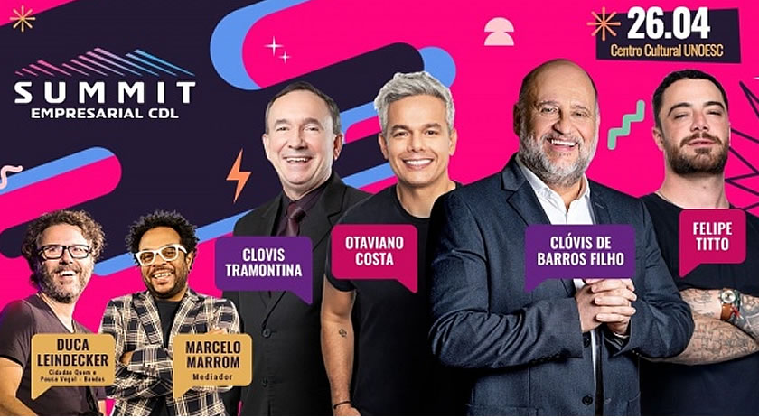 A programação do evento conta com mais de 8 horas de imersão, com quatro palestras nacionais, com nomes renomados no mundo dos negócios como Otaviano Costa, Clóvis de Barros Filho, Felipe Titto e Clovis Tramontina, cada um trazendo sua expertise e visão única para o palco e mais dois cases de sucesso regionais. Para completar a experiência e as novidades, o Summit Empresarial será apresentado por Marcelo Marrom de uma forma única. E para encerrar a programação em grande estilo acontecerá um show acústico com Duca Leindecker.