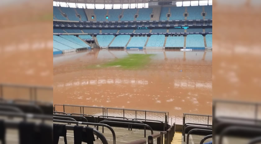 Neste sábado, dia 4, os estádios do Grêmio e Internacional foram inundados pela grande quantidade de água que trasbordou do Lago Guaíba e invadiu as ruas da região histórica da cidade. Imagens divulgadas nas redes sociais mostraram os dados nos locais.