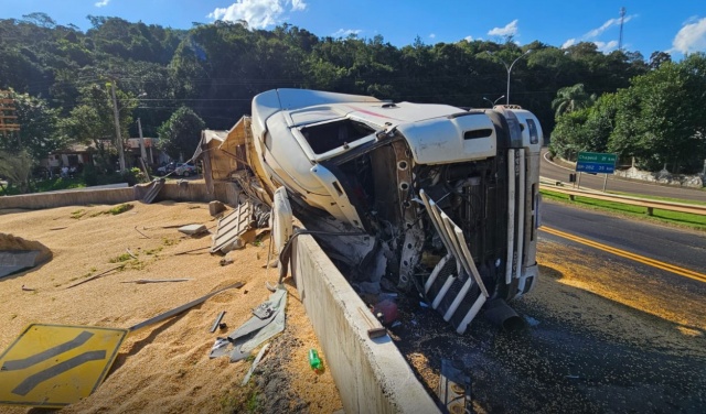 Uma carreta tombou na cabeceira da ponte do Goio-Ên, que liga os estados de Santa Catarina e o Rio Grande do Sul, na SC-480, em Chapecó (SC).