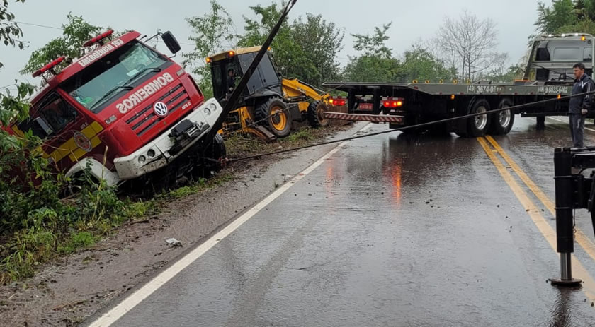 Segundo a guarnição, a equipe seguia para combater um incêndio em um veículo na linha Tigre, interior do município, quando o caminhão do quartel saiu da pista.