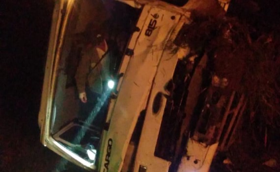 Ao chegar ao local, a guarnição encontrou o caminhão tombado fora da pista, em meio à vegetação. Um dos ocupantes, um homem, estava consciente e orientado. Ele relatou que, no momento do acidente, foi arremessado para fora do veículo pelo para-brisa e caminhou até o local onde foi encontrado pelos bombeiros. O homem queixava-se de dor na perna esquerda, com um pequeno hematoma próximo ao joelho e escoriações na região do tornozelo. Após os procedimentos de imobilização com colar cervical e maca rígida, ele foi conduzido ao hospital da cidade para atendimento médico.