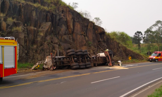 Um tombamento de carreta causou derramamento de óleo na pista, na tarde desta quarta-feira, dia 11, na SC-157, em Quilombo, no Oeste catarinense.