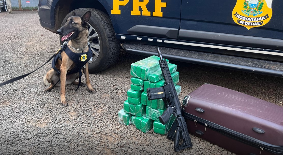 Segundo informações, a Polícia Rodoviária Federal abordou o ônibus na BR 480 esgotou o veículo até a rodoviária de Chapecó. Na rodoviária, Com o auxílio da cadela “Quantica” os policiais localizaram grande quantidade de maconha, um fuzil 556, munições e carregadores.