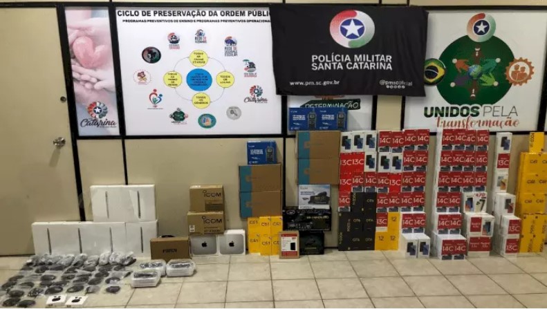 Duas mulheres foram abordadas pela Polícia Militar (PM), na noite desta quarta-feira (11), com mercadorias ilegais em um ônibus em Porto União, no Planalto Norte. A operação resultou na apreensão de 159 smartphones, nove rádios PX, três rádios HT, oito MacBooks e diversos outros equipamentos de informática.