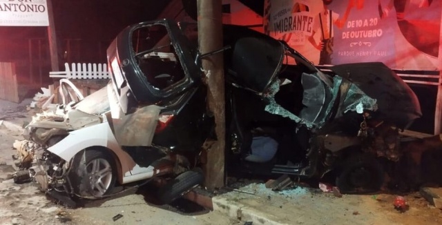 Um acidente em Timbó fez os dois carros envolvidos virarem um verdadeiro amontoado de sucata. Os motoristas e a passageira sobreviveram, mas os veículos chegaram a dobrar ao meio com o impacto contra um poste. Eles estavam em alta velocidade, contou a mulher aos policiais militares.