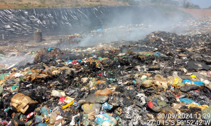 O Corpo de Bombeiros precisou fazer uso de 6 mil litros de água para combater as chamas em um aterro sanitário, na manhã da última segunda-feira, dia 30, em Fraiburgo, no Meio-Oeste.