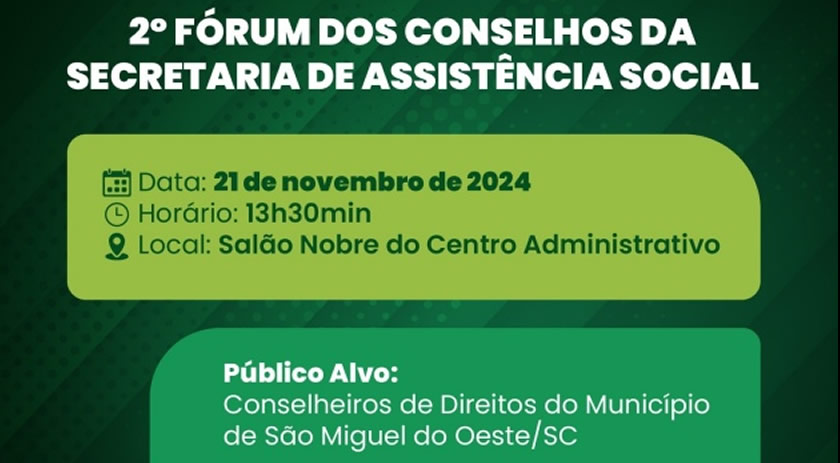 A Secretaria de Assistência Social, realiza na próxima quinta-feira (21), o 2º Fórum dos Conselhos vinculados à secretaria, no Salão Nobre da Prefeitura.