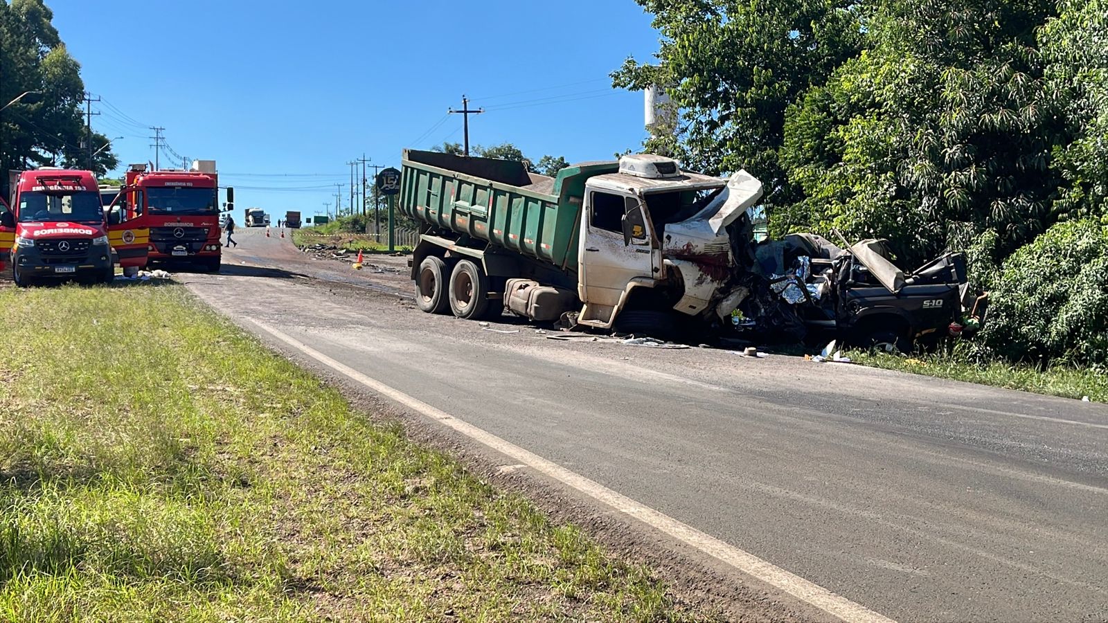 Uma caminhonete GM S10, durante uma ultrapassagem, bateu na lateral de uma carreta, rodou e colidiu de frente com uma caçamba.